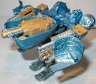 Apache is a cool, composed authority figure, but he's also shown a slightly eccentric side since he began transforming into a mandrill, snarling when upset. Recently, he and the suddenly cautious Lio Convoy have locked horns over the execution of operations. His entire body is a mass of weapons, and his "Mode 3" fortress mode's fusillades are powerful indeed. He also enjoys heavy metal music.