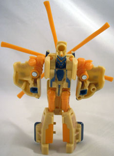 Bumblebee has been fighting airborne Decepticons for ages, so he knows just how to deal with them. Grindor may be able to hover well out of range of his weapons, dropping bombs with chaotic glee, but the Autobot warrior still has a few tricks. He weaves through the streets at top speed, forcing the Decepticon to maneuver constantly between buildings. Eventually Grindor will make a mistake. As soon as his rotor brushes a building, he'll come crashing down, and then Bumblebee will have him. |