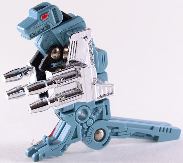 Takes it easy when moving, but his claws and fangs are the strongest of all the cassettes. The most violent of cassettes. While not as strong as Zaur, he has the best kicking power. Respects the Dinobot Grimlock. Carries Fire Blaster.