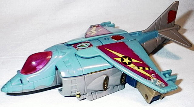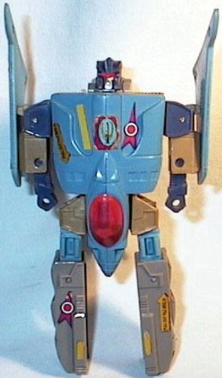 Astute and resourceful. Devises inspired defence plans while hovering menacingly above the battle scene. Ready for instant action with vertical take-off. Visible tracer capability means targeting is super-accurate. As a plane, rotating action missile launcher gives enormous fighting power. As a robot this converts to freestanding weapon backup.