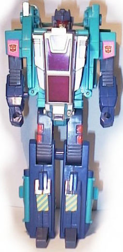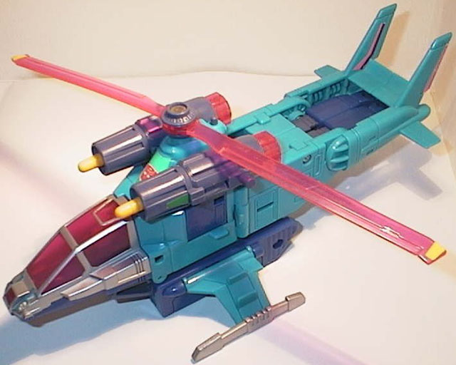 The only airborne Turbomaster. Ruthless and without fear. Through his super technology, eavesdrops on Decepticon communications and predicts their evil plans. Uses an extra sense 'Dodge' to guide the Turbomaster ground team through danger. Feared and respected by even the most hardened Decepticon for his brilliance and speed. As helicopter, swoops into battle, to do terrible damage with two turbines and seven missiles. As robot, thunders impressively through all in his path with hand held turbo power.