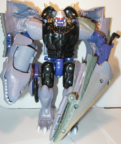 Millions of years ago, Tyrannosaurus rex ruled the earth. Today, Megatron plans to do the same! Duplicating dinosaur DNA stolen from human research labs, the evil leader has re-engineered his body structure and equipped it with fearsome high-tech firepower! Poisonous paralyzer fluids blast from his gaping jaws, while his powerful pincher claw can cut an enemy in half! Be afraid, earthlings. Be very, very afraid!