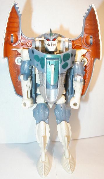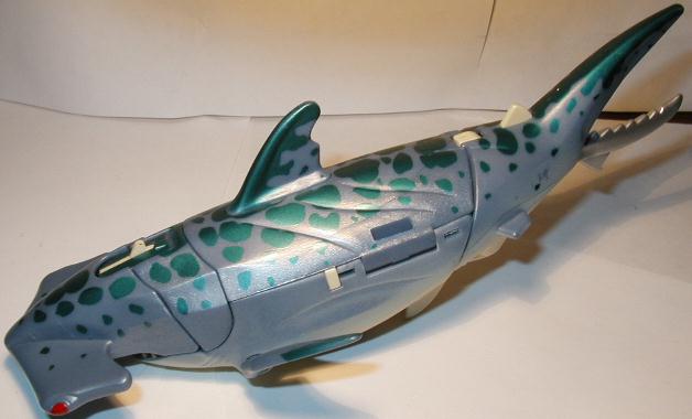 Just when the Predacons thought it was safe to go back in the water. Cybershark rises to the surface for a fearsome feeding frenzy! Like a turbo-charged torpedo speeding through the sea, Cybershark searches the ocean depths for Predacon enemies. Upon finding the enemy he launches his robotic hammerhead to knock 'em out cold, the finishes the job in robot mode by filleting his prey with his switchblade tale.