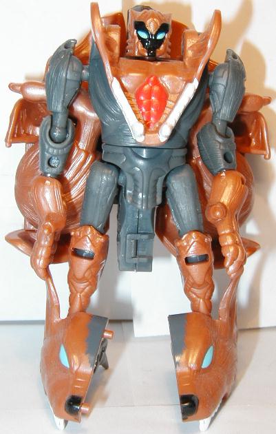 Snarl is seldom seen until the instant he attacks. His camouflage coloring allows him to sneak into Predacon base-camps undetected. Powerful legs give him the ability to lunge forward to attack startled enemies, and in robot mode he can jump straight up to escape incoming missile fire. Snarl is a fearless fighter whose gnashing, serrated teeth and razor-sharp claws are enough to fend off would-be attackers. if they know what's good for them!