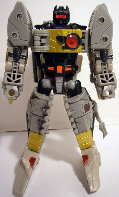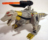 Grimlock keeps a collection of the parts he's torn off his Decepticon enemies. His super-thick ultramantium skin in both robot and dinosaur mode is coated in energy-absorbing materials, making him nearly impervious to damage. There are many who might say much the same thing about his mind. He is acutally quite smart, but a programming flaw in his speech cneters gives him only the most basic communications skills. He dislikes the weak, but is dedicated to the protection of those he views as lesser creatures. The only thing he hates more than weakness, in fact, is those who exploit the weak.