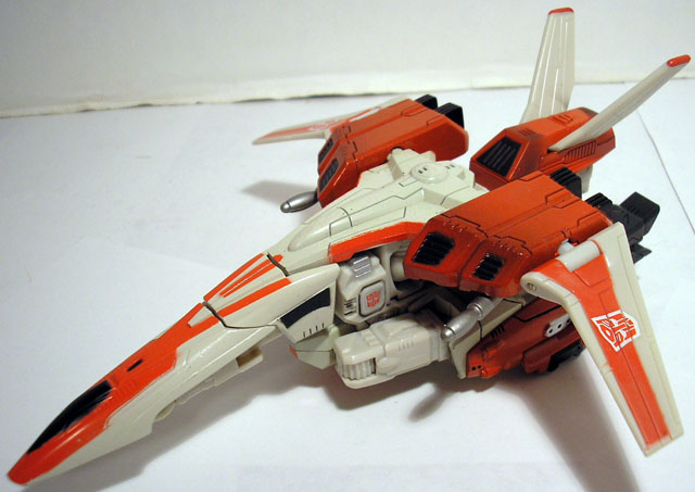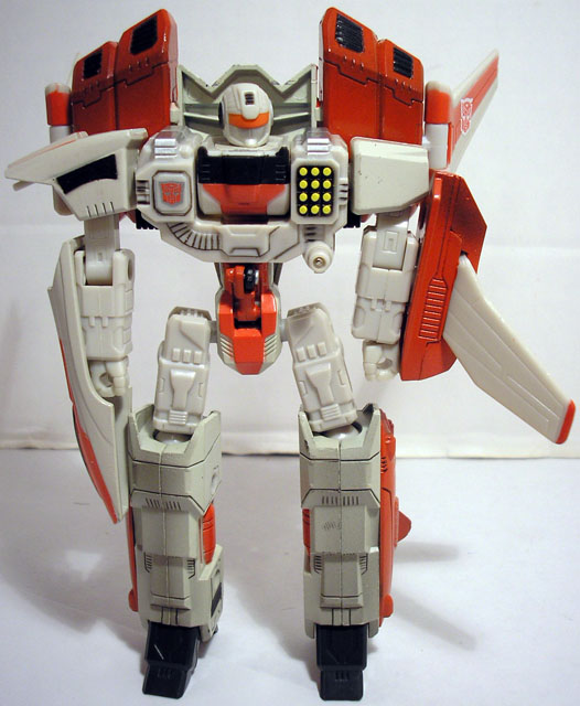 Before the Great War between the Autobots and Decepticons broke out, Jetfire was a partner and friend to Starscream. The two were as close as brother; the one as calm, rational and slow to anger as the other was jealous, erratic and arrogant. When Starscream joined the Decepticons in attacking the Autobot held cities of Cybertron. Jetfire was slow to choose sides. He was hesitant to join in the slaughter of largely defenseless Autobots, but did not want to take up arms against someone he'd considered a friend.