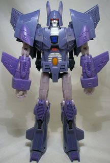Recolors: This mold was recolored from Transformers: Universe Classics 2.0 Cyclonus (2009), Gentei Strafe (2009, Japan), Challenge at Cybertron Cyclonus (2010, Asia), and Transformers Collectors' Club Shattered Glass Cyclonus (2010) and was later colored into E-Hobby United Cyclonus (2011, Japan) and Botcon 2014 Ferak (2014). Nightstick was recolored into United Nightstick (2012, Japan), Vector Oracle (2012, Japan), and Botcon 2015 Nebulon (2015). |