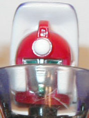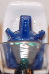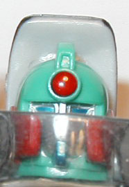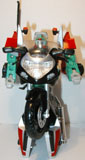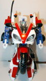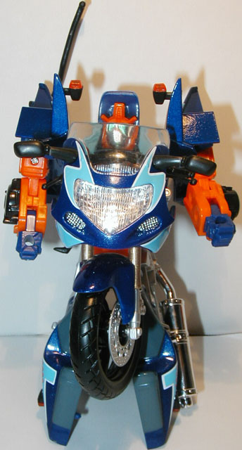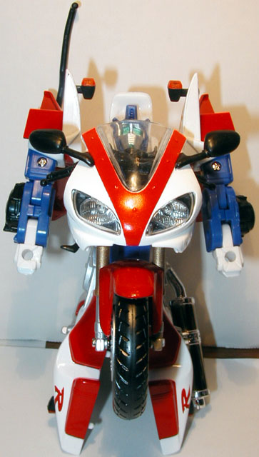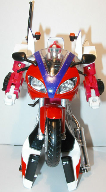 The transformations on these guys are all the same though. Pull out the rear section and rotate it 180°. Flip out the lower sections to form the shoulders and straighten the arms accordingly. Place the shoulder lock across the back to stabilze teh arms (mistransformed in the photos: the shoulder lock is the piece sticking up on each like a bumper-car antenna). Pull the legs down and lock into place. Flip the front wheel forward and pop the head up from the gas tank and you're done. Simple, but nice enough.