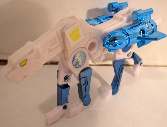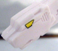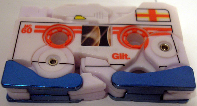 Instead of a recording module, his cassette mode has a head-cleaner module with diagnostic and repair functions. He does periodic check-ups on the internal functions of his carrier [presumably Soundwave], so that his fellow Cassette warriors will always be in top form, and live up to their full potential. Glit does not have any weapons, but he does not fear even when facing a heavily armored giant warrior of destruction.