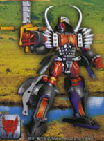 The combined form of Liojunior, Skywarp and Santon. A fusion of Liojunior's courage, Skywarp's intelligence and Santon's kindness, he is a symbol of hope for the Cybertrons. From his Magnablade, a combo-sword made from the union of three component robot's weapons, Magnaboss fires laser shockwaves that mow down approaching enemies. He can also shoot off tremendous Angolmois Balls from his horns and fire Sky Missiles from his body.