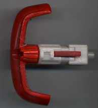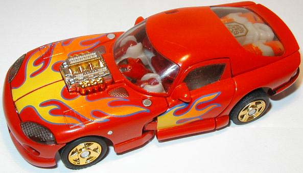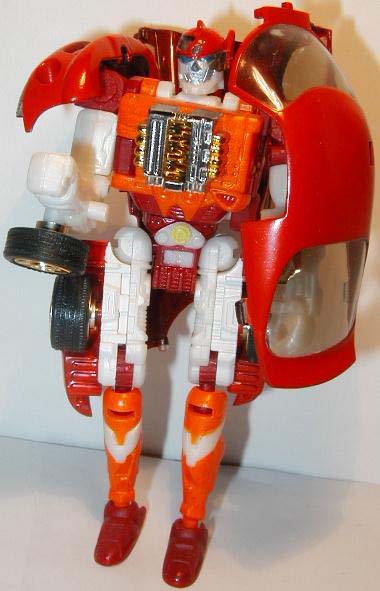 When he was newly outfitted with a Spark Engine, the biggest image data within Speedbreaker's data banks overlapped with his identity circuits and he achieved a metamorphosis into a red sports car. No one was more surprised by this form than he, not even his brothers or Fire Convoy. His acceleration and top speed have markedly increased, and he's now able to make short-range warps on highways. The firepower of his powered-up Excel Bowgun and Dragsaber has increased 160%, but his skill hasn't kept up with the increase, so he can't exhibit optimum performance.There are no known variations of this figure.