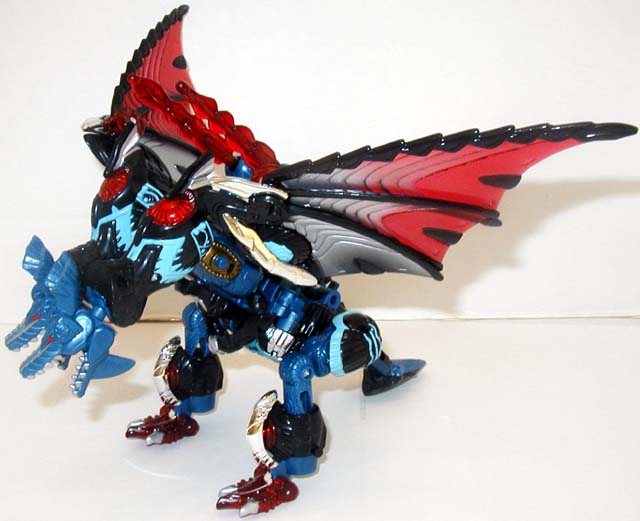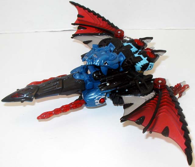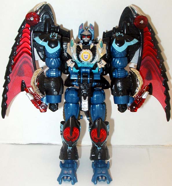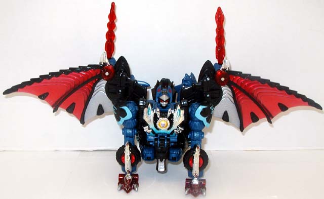 Abilities: Deathsaurus' new form was engineered to have six distinct transforms including a dragon mode, an aerial vehicle mode and a high-speed ground mode. These forms, along with his dual Timelines blade weapon make him a formidable foe. Utilizing the unique materials in his wings, he can convert sunlight into dark energy, which will corrode any type of metal upon contact. Deathsaurus is one of the strongest Decepticons.