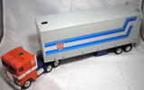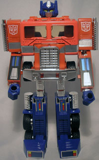 Recolors: This mold was recolored from the short smoke stack variant of Optimus Prime (1984). The long smoke stack mold was repainted into Generation 2 Optimus Prime (1993), JAFCON Convoy (2000, Japan), and New Year's Convoy (2002, Japan). The long-smoke stack cab was recolored into the cab of Ultra Magnus (1986), Matrix Glow Ultra Magnus (2001, Japan), Movie Preview Ultra Magnus (2001, Japan), and Botcon 2007 Pepsi Optimus Prime (2007). |
