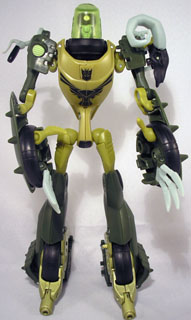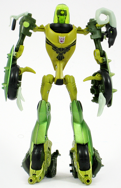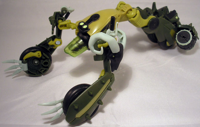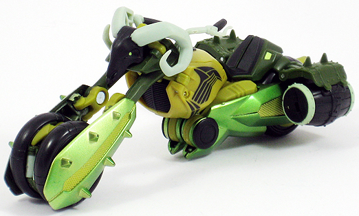 | Vehicle to vehicle combat is something all Transformers are skilled in, but with Oil Slick, it's a particular specialty. He knows more about how to disable and destroy a vehicle than almost anyone else in the galaxy. He knows that if he can break down the robot inside, the vehicle will come screaching to a halt. Canisters attached to his sides dump special chemicals that unlock the deepest fears of any robot exposed to them, while at the same time rotting wheels and burning through axles. Once the vehicle mode is destroyed, Oil Slick moves in close to finish off with his chain weapon. |